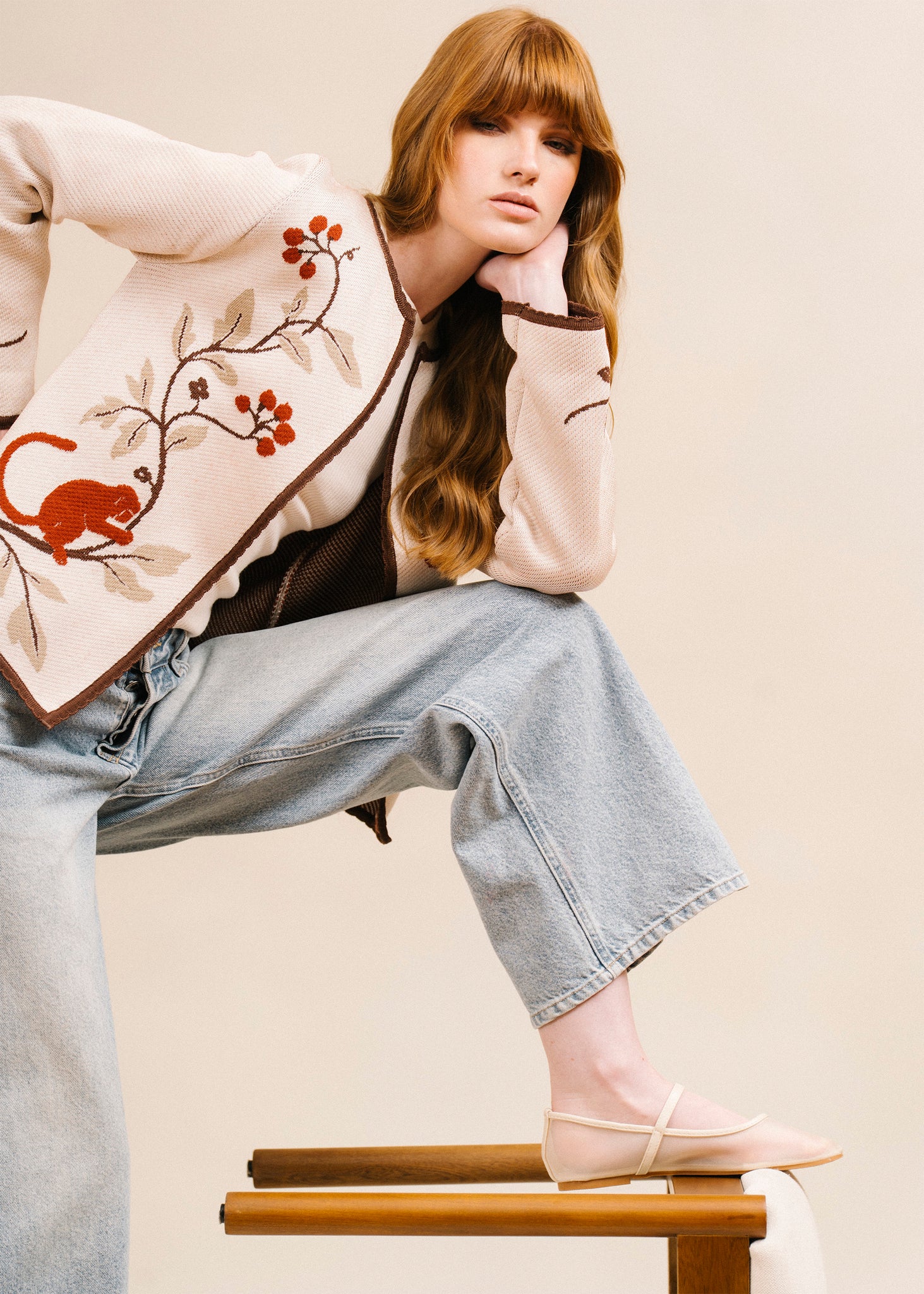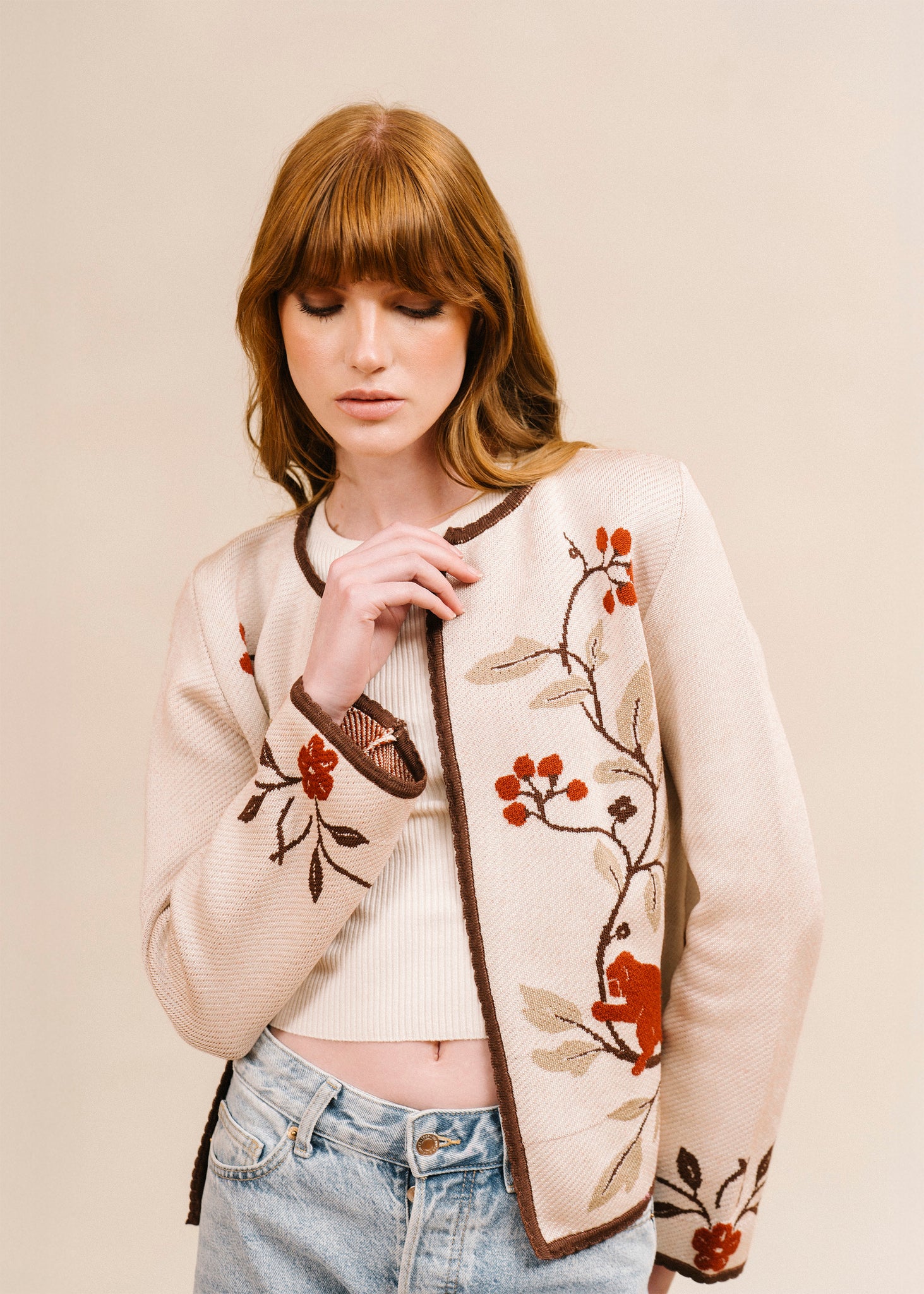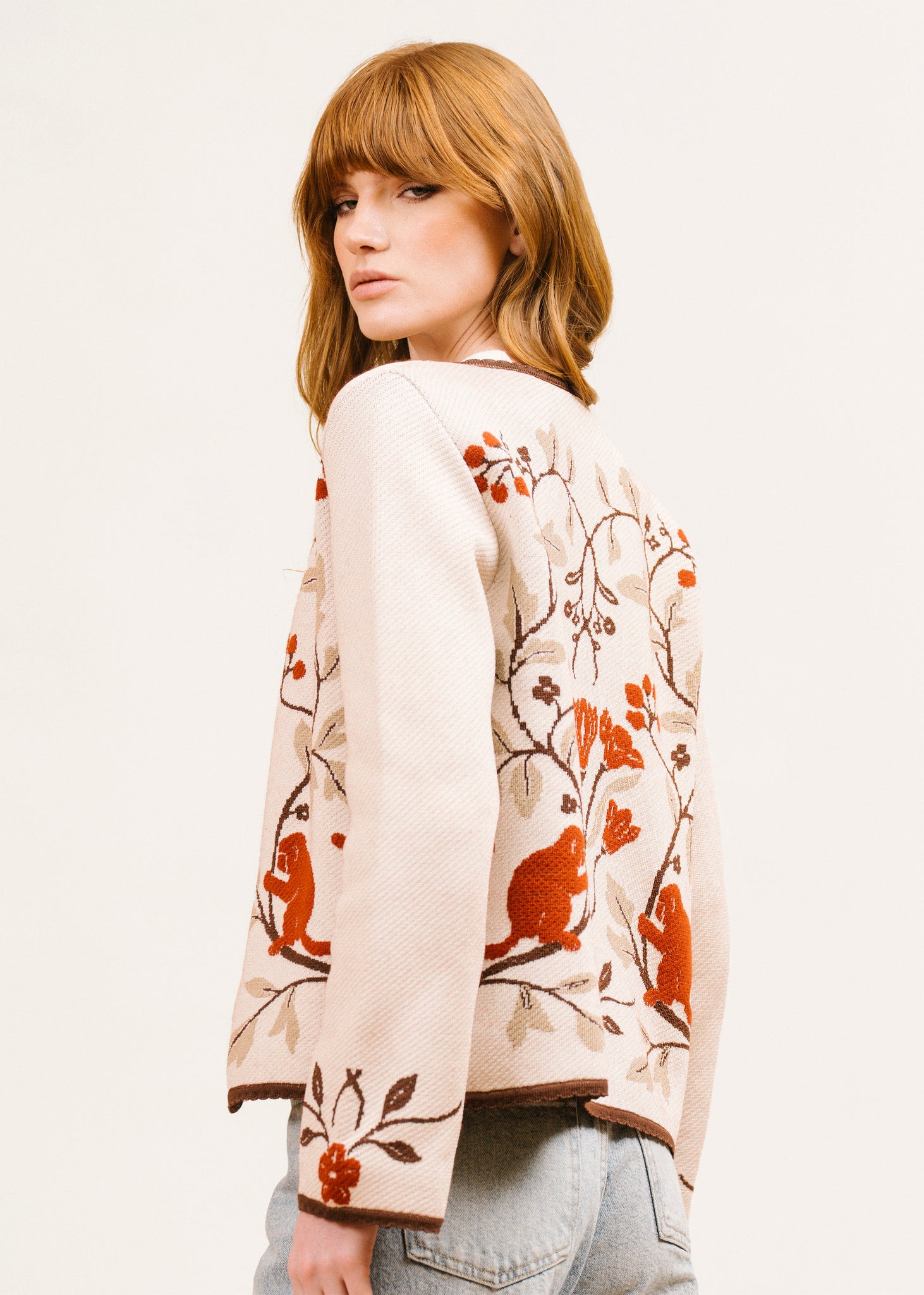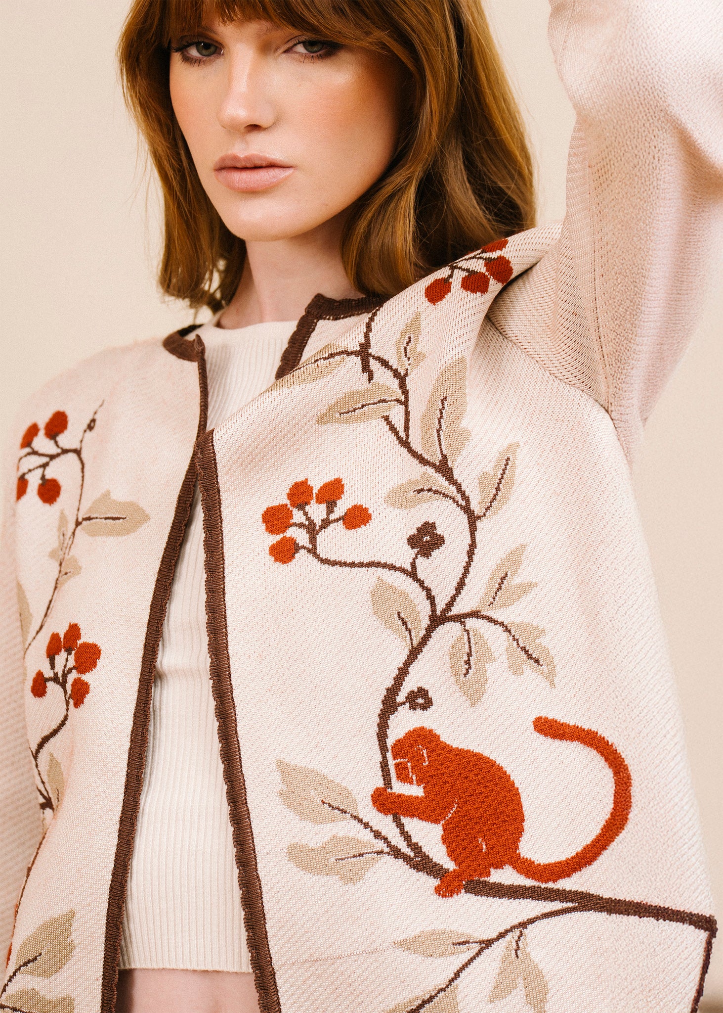 La Chaqueta Ateles está confeccionada en jacquard de tejido de punto con un elegante motivo de Mono Araña que realza su diseño sofisticado. Su solapa en zigzag añade un toque coqueto y distintivo, convirtiéndola en una prenda única y atractiva, perfecta para destacar en cualquier ocasión.