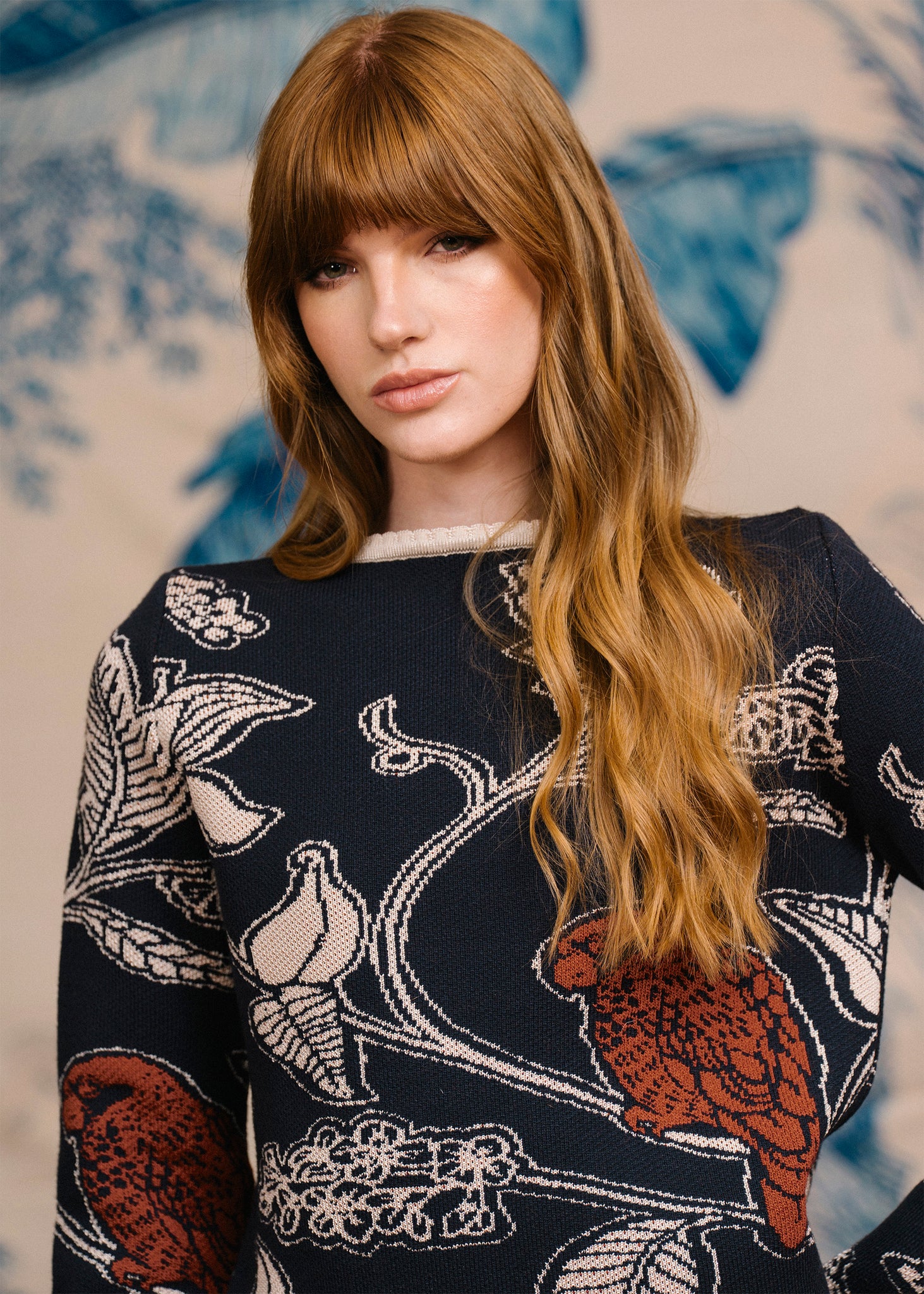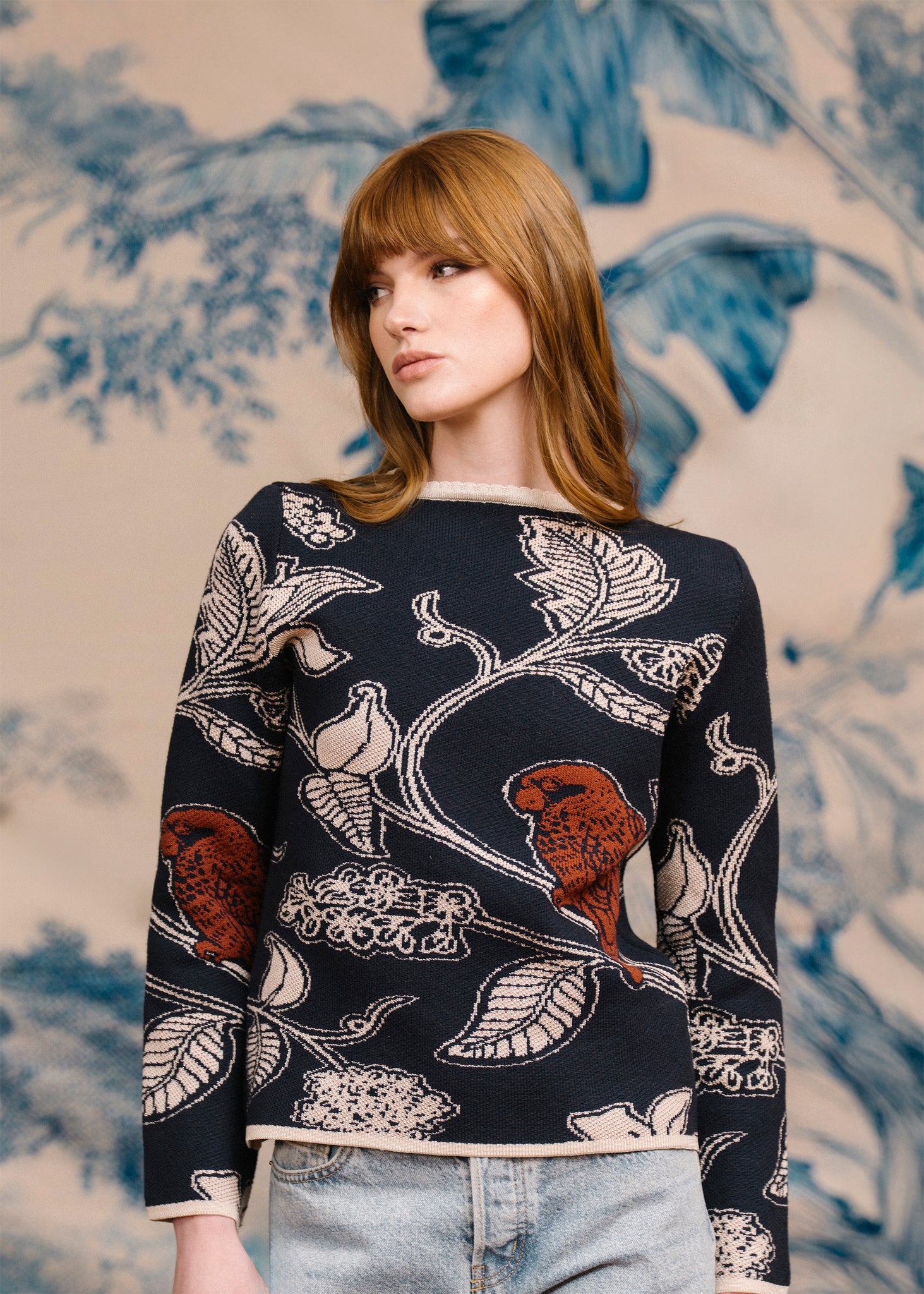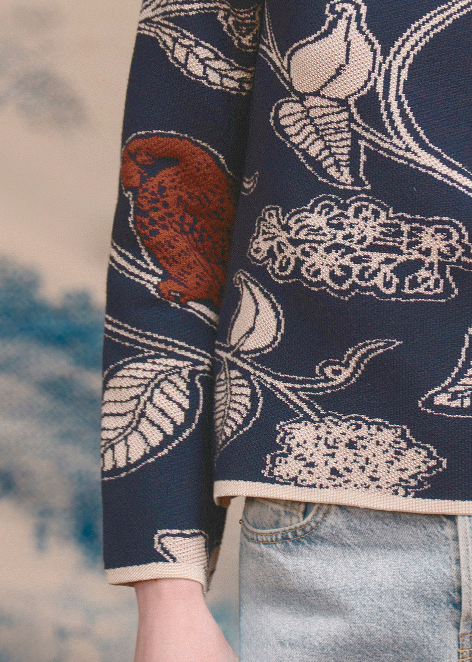 El Saco Amazonas está hecho en un jacquard de tejido de punto con un distinguido diseño de Loro Real Amazónico.