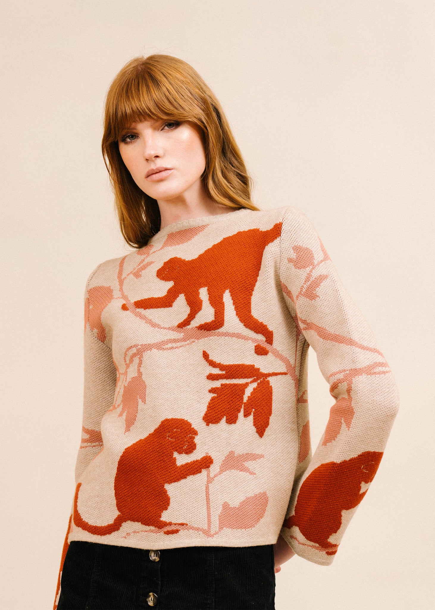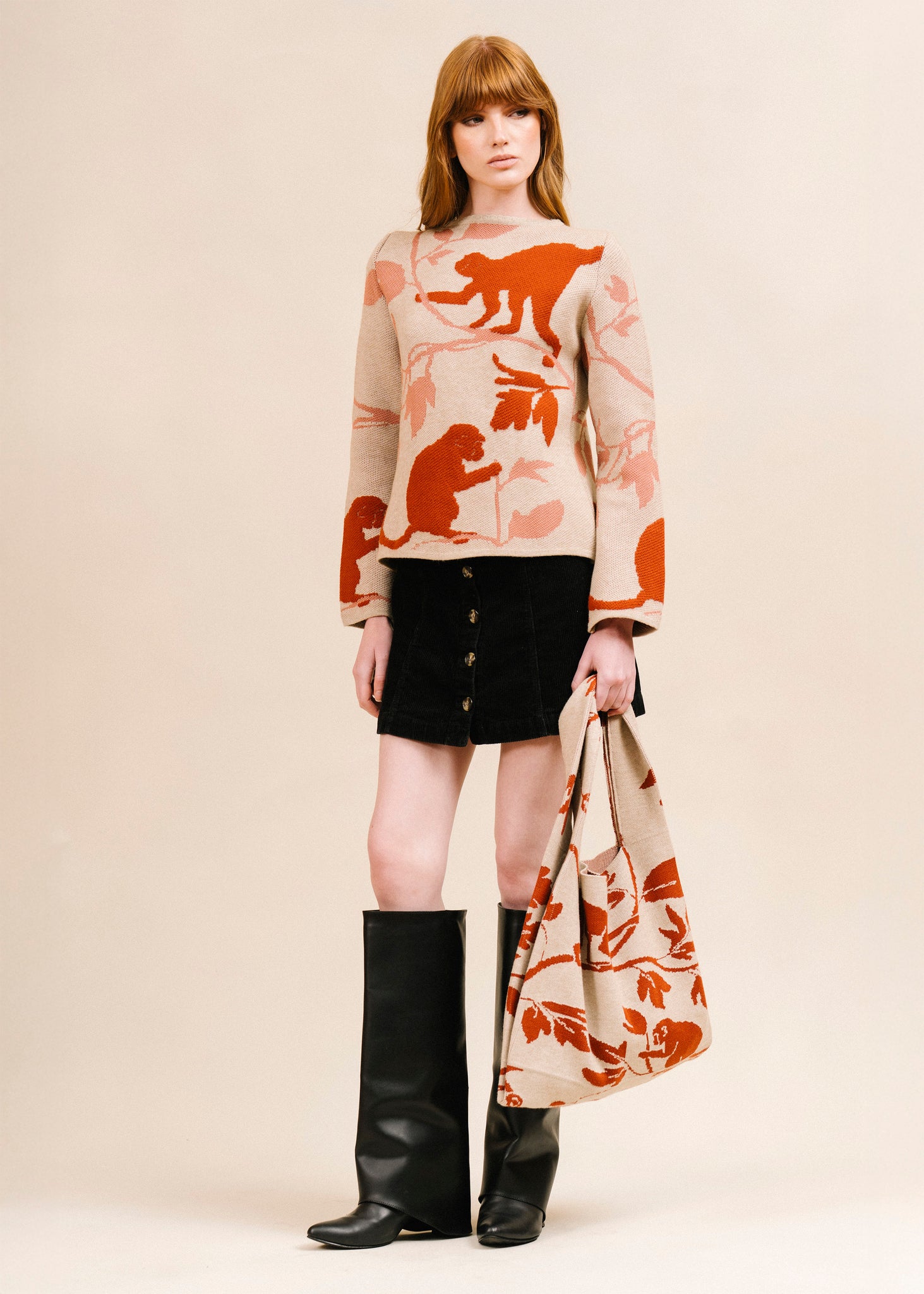 El Saco Cumare está hecho en un jacquard de tejido de punto con un distinguido diseño de Mono Araña.